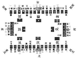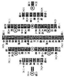)乾既位西北,財坤當位東南,以地不滿東南,故巽長女代居其位,巽亦先天兌之反也。是以坤退居西南,三爻皆變而之乾;乾三爻皆變而之坤,互相反對,而乾、坤之位縱矣。離火炎上而居南,坎水潤下而居北。坎三爻皆變而之離,離三爻皆變而之坎,亦互相反對,而坎、離之位縱矣。艮反先天震而位乎東北,巽反先天兌而位乎東南。艮三爻皆變而之兌,反而觀之,則為巽;巽三爻皆變而之震,反而觀之,則為艮,亦互相反對,而艮、巽之位縱矣。電激而雷,故震居正東先天離位,離火炎上,故以上爻變震。三爻皆變而之巽,反而觀之,則為兌。水潴為澤,故兌居正西先天坎位,坎水潤下,故以下爻變兌。三爻皆變而之艮,反而觀之,則為震,故震、兌左右相反對,而其位橫矣。邵子曰:震、兌橫而六卦縱,《易》之用也。至哉言乎,惟其如此,故今時所傳卜筮宮卦,亦乾、坤相反,坎、離相反,震、兌相反,艮、巽相反。乾宮之姤自坤,而反觀之,則為夬;乾之遯,反坤之大壯;乾之否,反坤之泰;乾之觀,反坤之臨;乾之剝,反坤之復也。坎官之節自離,而反觀之,則為渙;坎之屯,反離之蒙;坎之既濟,反離之未濟;坎之革,反離之鼎;坎之豐,反離之旅也。艮宮之賁自巽,而反觀之,則為噬嗑;艮之大畜,反巽之無妄;艮之損,反巽之益;艮之,睽,反巽之家人;艮之履,反巽之小畜也。震宮之豫自兌,而反觀之,則為謙;震之解,反兌之蹇,震之恆,反兌之咸;震之升,反兌之萃;震之井,反兌之困也。其遊魂、歸魂二卦,謂其不在八宮正變之列。以本宮第五爻變而得外體之卦,內三爻皆變,則為遊魂。曰遊者,自內而之外也。第五爻變而內三爻不變,則為歸魂。曰歸者,自外而反內也。周旋左右,升降上下,王者之禮法盡於是矣。