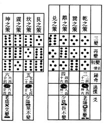 右蓍四十有九策,分而為二以象兩儀,而掛置一策於中以象人,左右策四十有八,蓋總卦爻之實也。八卦經畫二十有四,重之則為四十有八;又每卦各八變,其爻亦四十有八也。其揲法先以左手取左半之策握之,而以右手取右半一策掛置于中,而不復動,以象人居天地之中;其陰陽、寒暑、晝夜、變化一聽于天,而無與焉。一雖無與,而常與四十有八者並用。參為三才者也。次以右手四揲左手之策而歸其奇,或一或二、或三或四,於小指、次指之問,謂之扐,象三年一閏。又以右手取右半之策,餘一#2取三,餘三取一,餘二取六,餘四取四,歸於次指、中指之間,謂之再扐,象五年再閏。而後掛者,謂總所歸二奇置於掛之一所,如掛一法,《韻會》曰合而置之是也。其歸奇之數,不四則八,無所謂不五則九。得四為奇,一箇四也。得八為偶。兩箇四也。於是復合過揲之策,或四十四,或四十,分、揲、歸、掛如前法,為第二變。又合所餘過揲之策,或四十,或三十六,或三十二,分、揲、歸、掛亦如前法,為第三變。三變之後,然後視其所掛之策,得三奇為老陽,三偶為老陰。兩偶一奇,以奇為主,為少陽;兩奇一偶,以偶為主,為少陰。每三變而成一爻,十有八變而成一卦;一卦可變而為六十四卦,而四千九十六卦在其中矣。