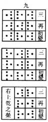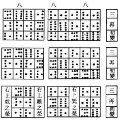 右三變皆奇,為老陽,乾之策者八。歸功得十二策,過碟得三十六策,以四約之,歸功得三,三個四過搽得九九個四九者,陽之極,變而為陰。《易》以變為占,凡陽爻之變者,通謂之九。