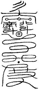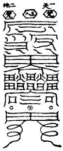 右,凡有壇廟等為人害者,面北書之,念咒五遍,取五方真O各一口,掐玉皇訣書之。書符時,存身為孝道明王、靈寶淨明天尊,二帝君直符,四聖衛護以行。當慎所用,不可妄行。此符行之既靈,則久而不必使人送於所在,自有帝君執之以往。