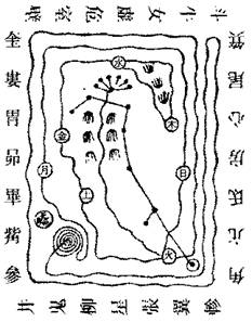 念咒訖,閉O入天門,即第三重壇。既入天門,如有仙人二人、玉童、玉女、侍香、傳言共六人。次長跪閉目,若有神人乘五色雲,服以上清衣,傳玉帝符,金書照耀,呼召子之名。復有童子一人,執彼瑤爵之中,有玉霞漿。北斗之中,有一黑O。南斗之中,有一赤O。日中有紅O,月中有白O,三台中有五色雜O,各一道流入盃中。汝能受之,再拜而飲。閉O放訣下壇,念二篇靈書,騰空如到天上,飛入北斗之中。三台之星,蓋頂而行,乃自@星步,而至F迴。身入斗六步而出,作三台之形,乃出斗口。左環七七步,犯火。又東行,自中過,凡九九步至太陽,朝祖師上帝。復乃右行,自北斗入西斗,八八步至太陰,朝祖師仙皇君。右旋而出,出即右行,復左,凡七反如環,此元色界也。定眼,見無色界中,諸仙來迎。於是周歷十方,謁三十二天帝、二十八宿。見一宿,即丁罡十二,以迴生于斗宿,即借箕宿之綱以行直。還望北斗大F之次,乃交鋒之山右旋,南向四十九步而過,重入火星宮。經於太陰,六六之後,而謁水星。由水東行,計六十四步,再迴而行,犯水。借綱復出宮,經於太陰之旁,八十一步,以成金星。細行達于斗口,三十五步而入土辰。由土返行,再入金星、水、木之宿。而後直望北方,金闕巍峨,即三清上帝之所在也。乃八步而進,長跪再拜。咒曰:
