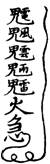 魁臺午時直符神吏暖炎寮,馬頭青花鴉腳,紅抱黑飛帶,豹皮裩,背負火瓢,手執火毬,身在赤雲中,部下三十六人兵甲赤旗,中有雷電風雨。